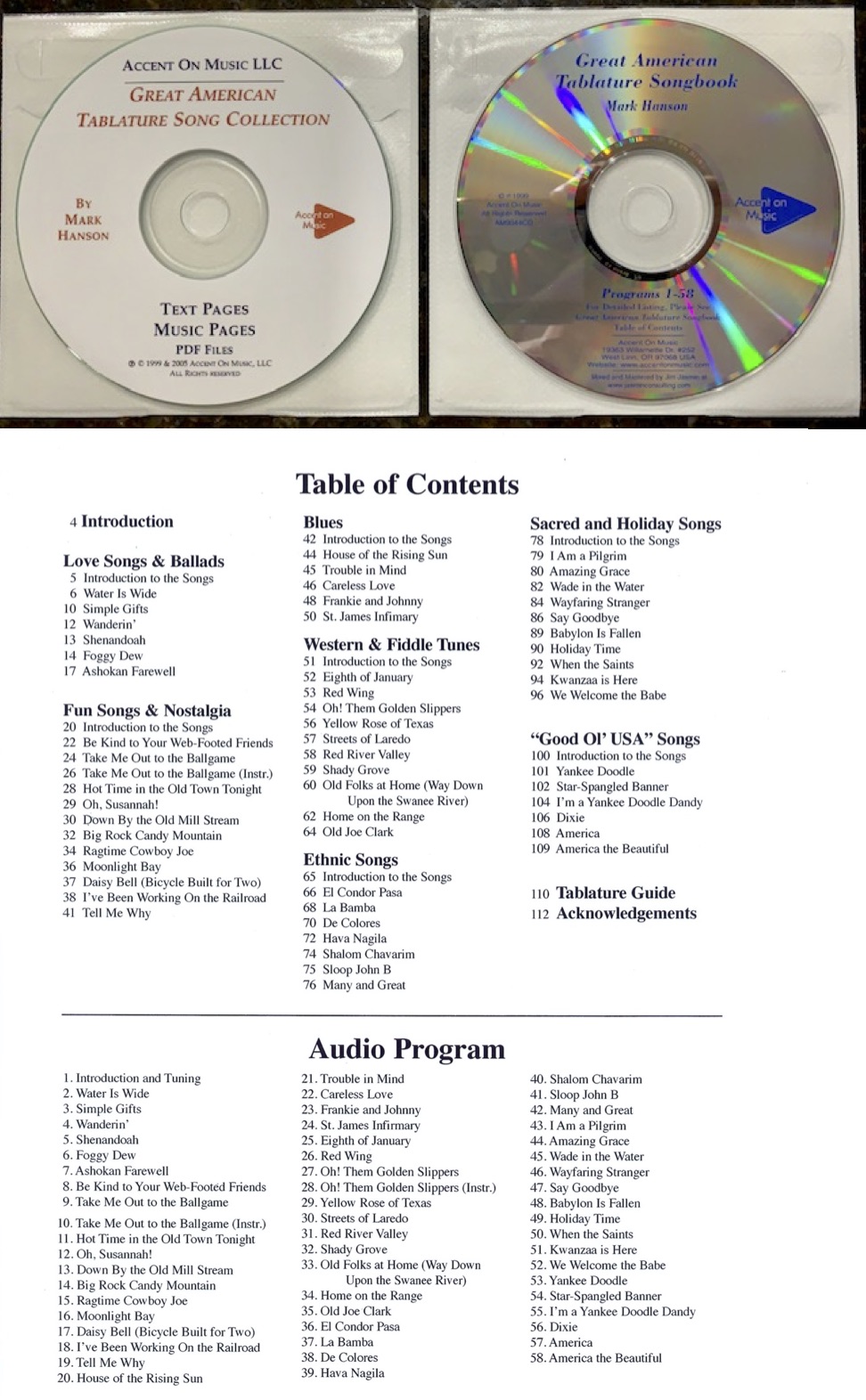 TAB and standard notation are provided as .pdf documents on CD-1, while audio examples on CD-1 include the guitar part panned to one side while a vocal is panned to the other.