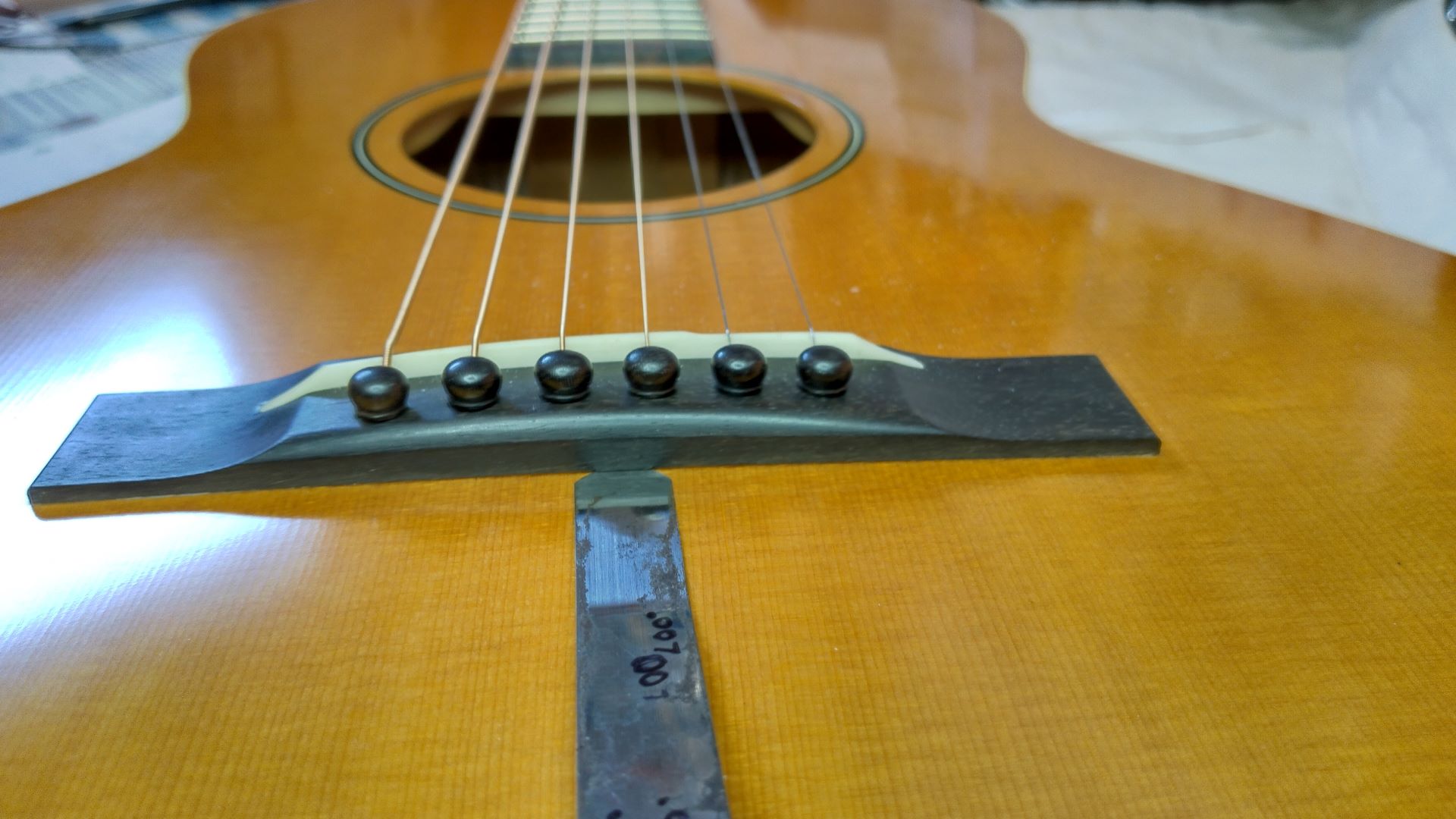 Prior to my purchase during a zoom meeting I had with Bob he measured the 6th string height at the 12th. fret and it was .122". I've attached photos of the saddle/shim and gap at the center back of the bridge/top which is a max. of 007" to a depth of about 030". Also photos showing where the bridge first loses contact with the top to the left and right of the center. This is where the edge of a .002" feeler gauge first slips in.
