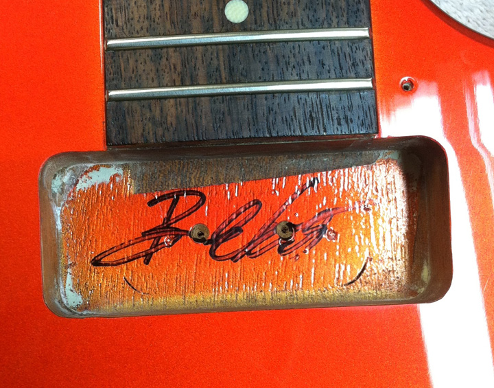 On one inspection I noticed 'case burn' in the nitro. I freaked out and they were so cool about it. I shipped it back and Bill Collings personally sprayed it in what they called 'Candy Apple Tangerine". He was even kind enough to sign it inside the pickup cavity. They were bending over backward to make me happy & being a punky NW grunge musician, I went for all I could get.