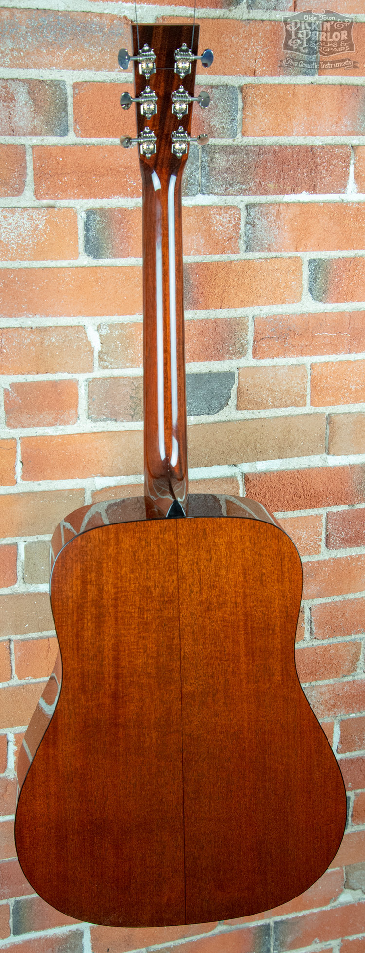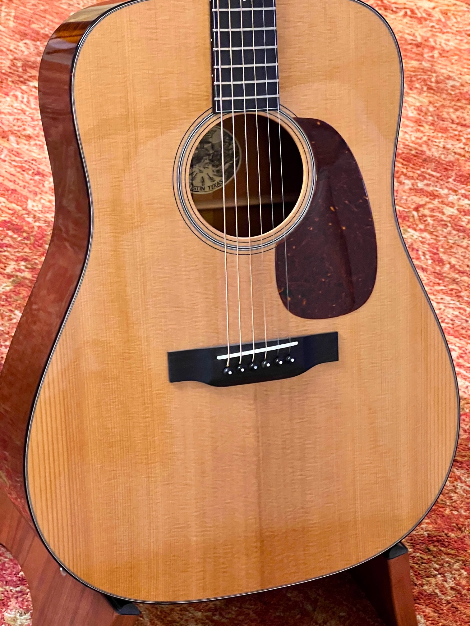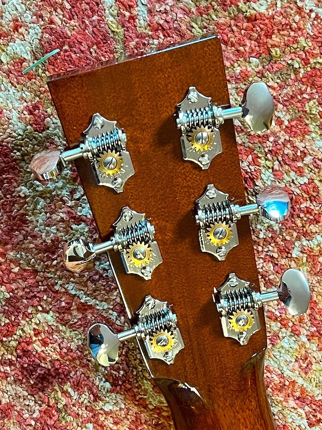 Custom features are: Baked-Sitka top, 1 3/4" nut, bound headstock (photo), bound fingerboard & Traditional Handmade Case. The neck is straight and set perfectly and the saddle has not been shaved for lower action. I go from soft finger-style to rock classics and it does it all and the factory specs have been perfect. The factory set up is untouched so you can adjust it any way you like. Weighs in at feathery 4.4 pounds.