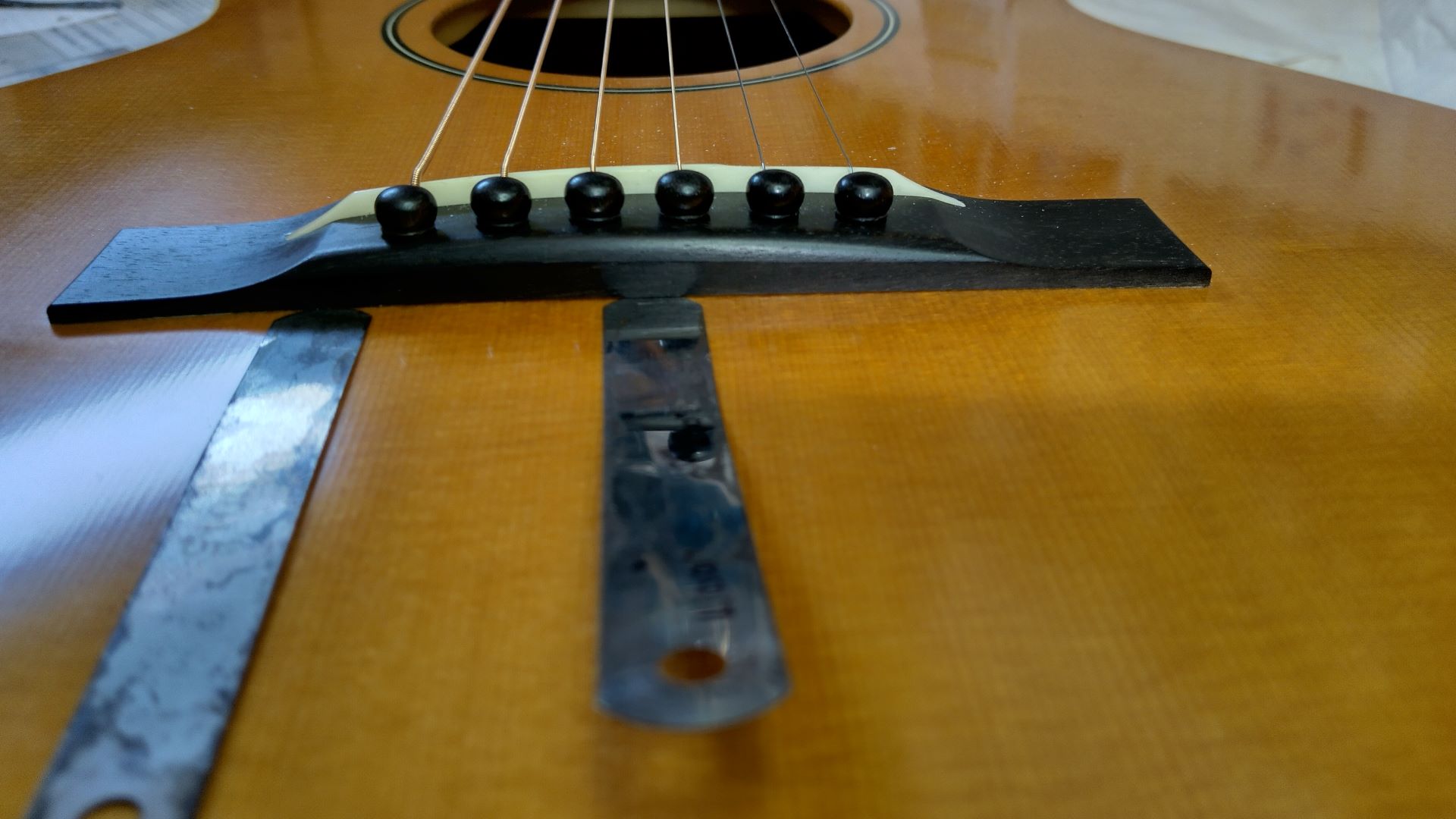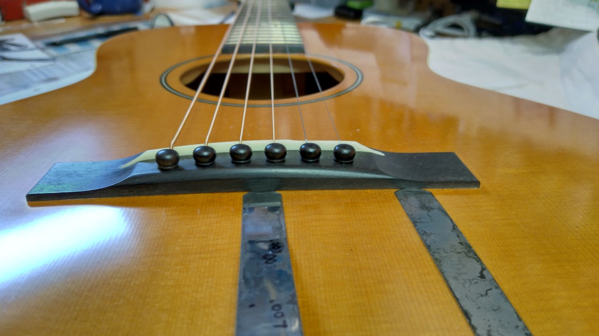 Prior to my purchase during a zoom meeting I had with Bob he measured the 6th string height at the 12th. fret and it was .122". I've attached photos of the saddle/shim and gap at the center back of the bridge/top which is a max. of 007" to a depth of about 030". Also photos showing where the bridge first loses contact with the top to the left and right of the center. This is where the edge of a .002" feeler gauge first slips in.