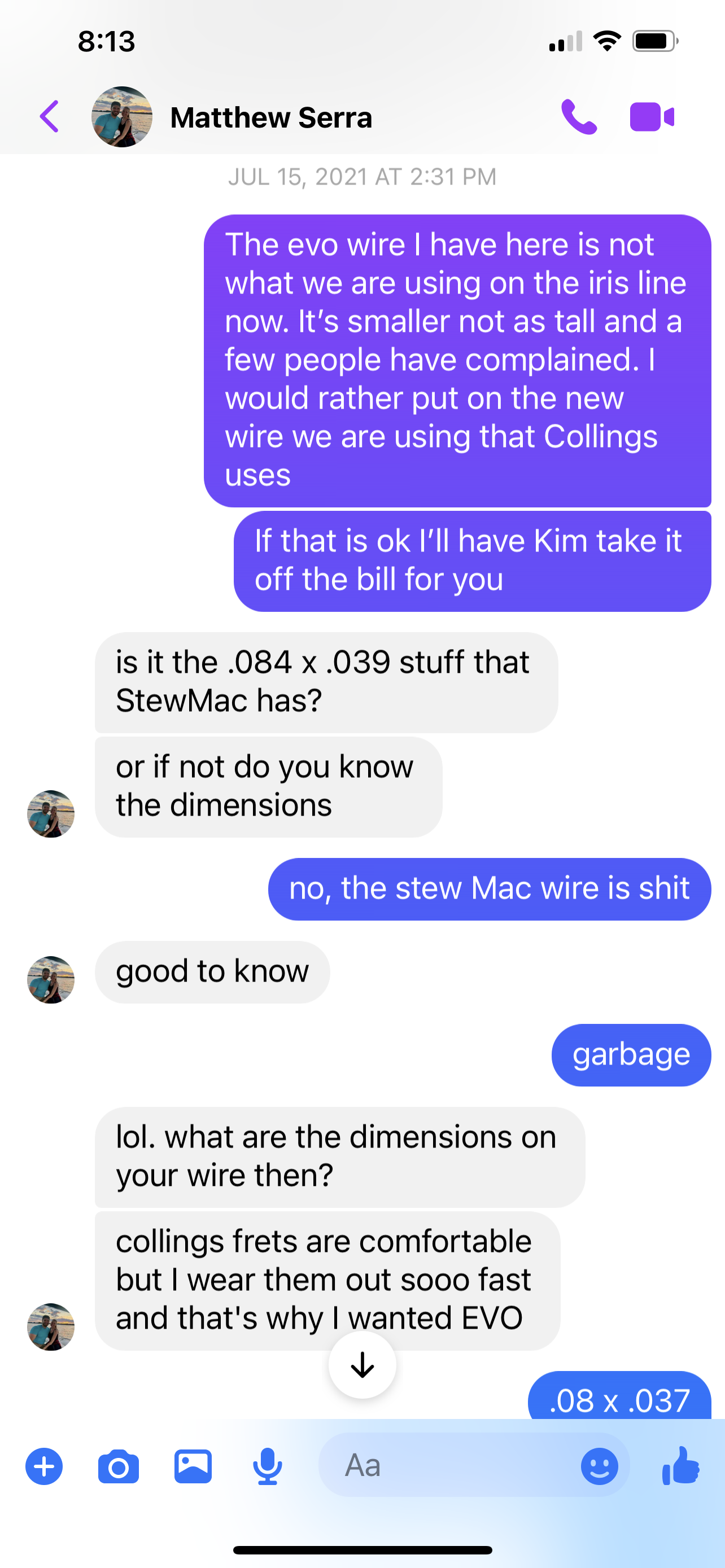 The day the guitar is being fretted, Adam says he ran out of EVO frets and tries to talk me into nickel frets. I tell him I don't want nickel frets, he can order EVOs and I'll wait. He then somehow magically found a set of EVOs and installed them.